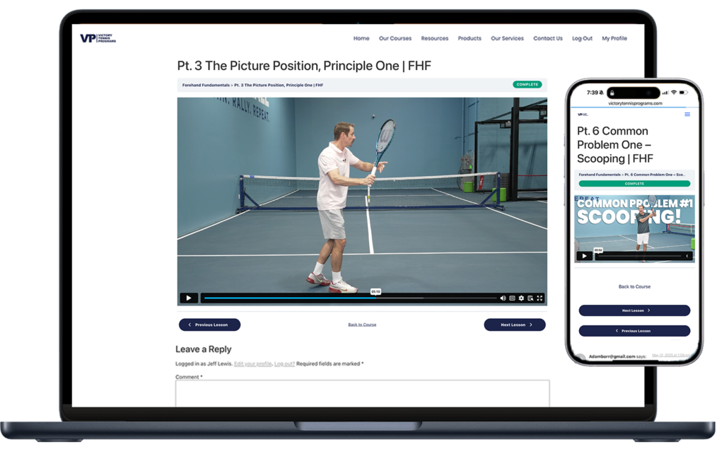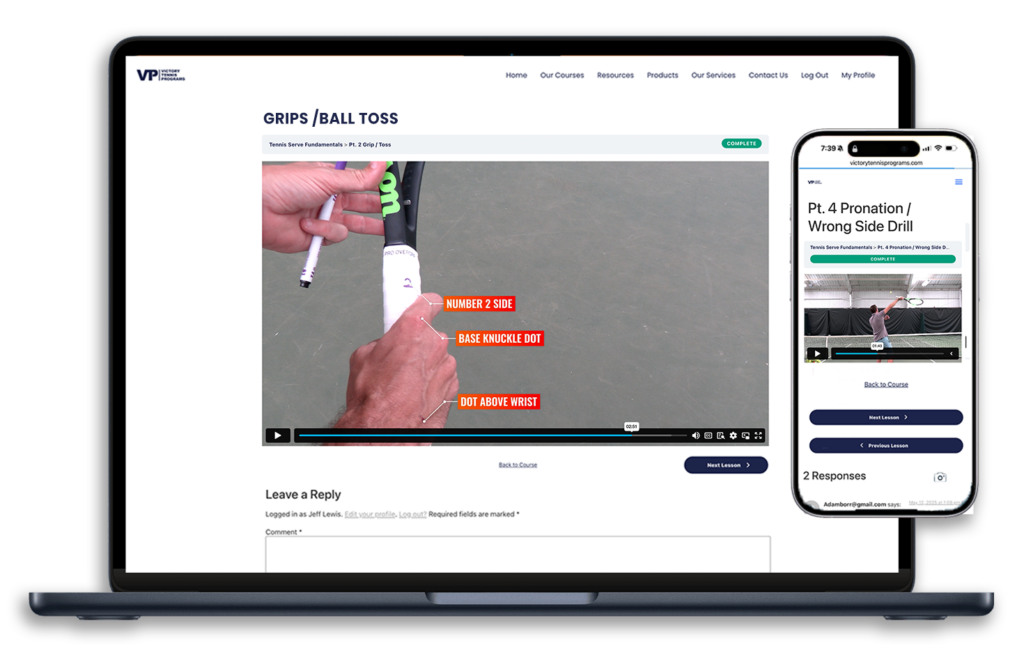 To celebrate the launch of Victory Tennis Essentials I’ll be including a personalized video review of the stroke of your choice. You’ll receive a narrated, split screen analysis of your stroke compared with a pro. Also included is drill recommendations to make the changes you need to improve.